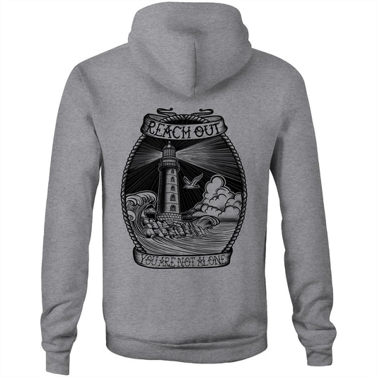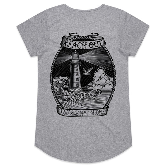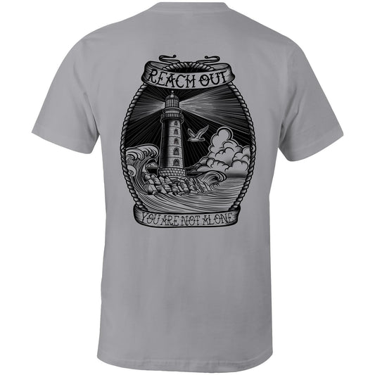 The t-shirt’s design embodies this message. The lighthouse represents guidance, hope, and safety—the support needed during life’s darkest storms. The crashing waves symbolize the challenges men face, while the shining light serves as a beacon, reminding them that help is within reach. The words “Your Mental Health Matters”, Reach Out” and “You Are Not Alone” reinforce a message of connection and support, encouraging men to seek help and speak openly about their struggles.