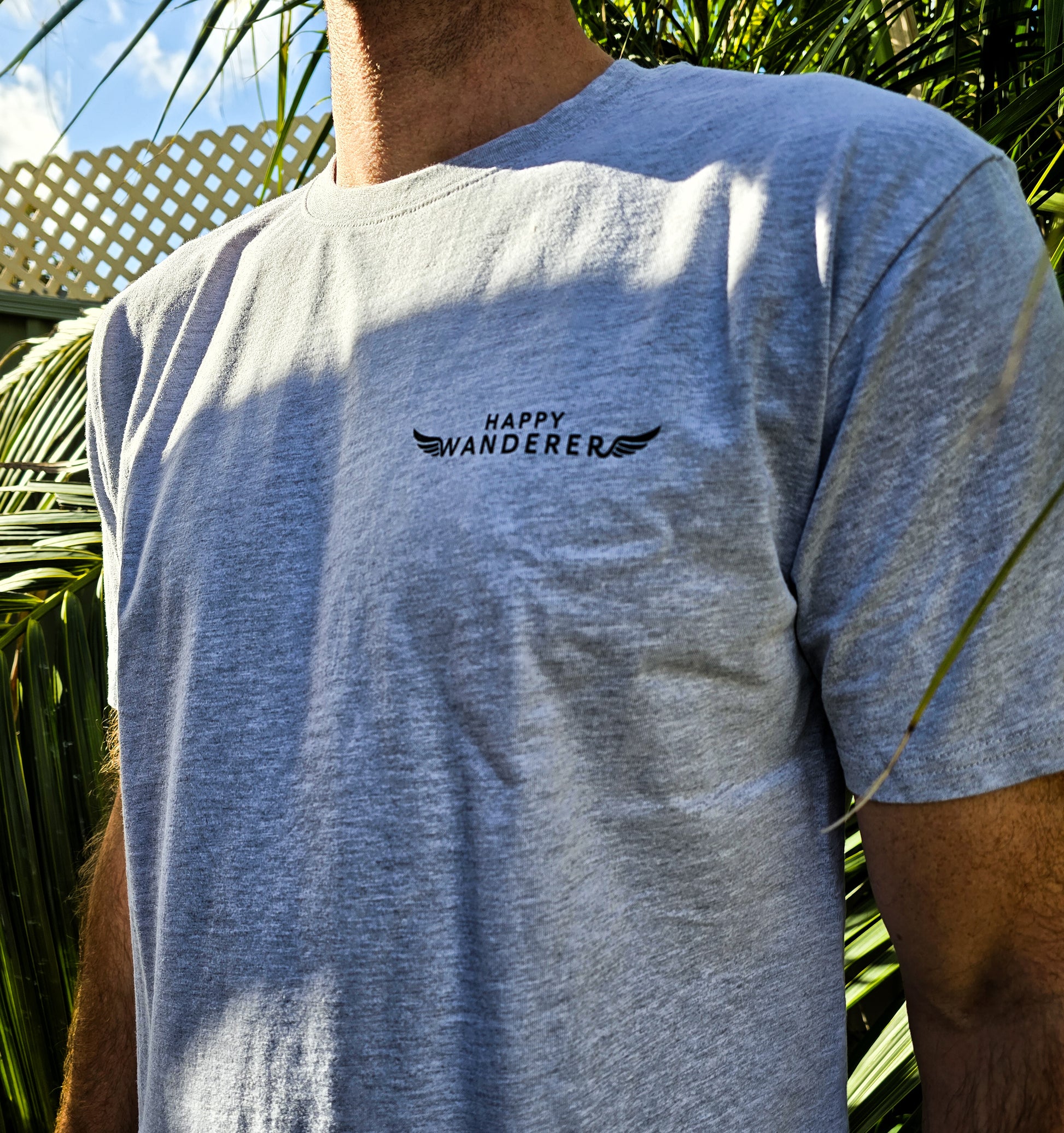 - White: A relaxed fit, thicker cotton tee, featuring the Happy Wanderer logo on the chest and a bold A3-sized design on the back. (This page)